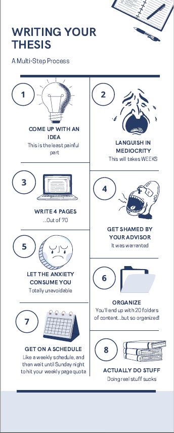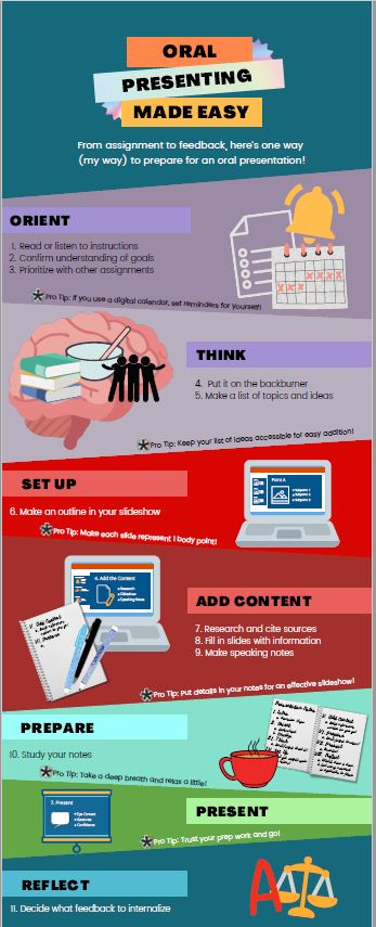 In her reflection on this infographic at the right, “Oral Presenting Made Easy”, Anna Moyers stresses the care she used in selecting the visual and spatial elements to carry the communicative burden of the message and yet remain friendly and accessible for people with color blindness and other visual differences. She also stated that she attempted to sync up colors with the types of tasks involved in the process while simultaneously assisting the spatial flow of the piece.