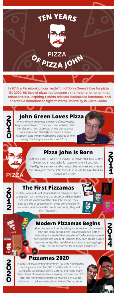 An infographic by Emily Pritchard is shown at left that covers a ten year span in the life of “Pizza John”. Her comments on this piece indicate that while she primarily uses the linguistic mode for her work she has noticed that there are many things that are much easier to convey in images with a sprinkling of text instead of more text-heavy genres. One such instance is the image at the lower right of Hank and John Green . Since the reader brings with them their own experience when the come to a text, the image of the Greens here can allow a better sense of who they are and may trigger memory or other prior knowledge associated with images that aural or text cannot access.